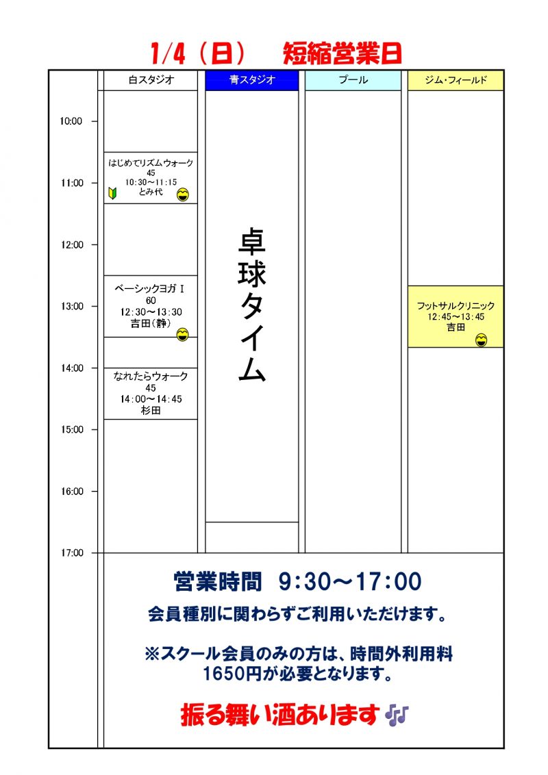 1/4(日)短縮営業日レッスンスケジュールはこちらです