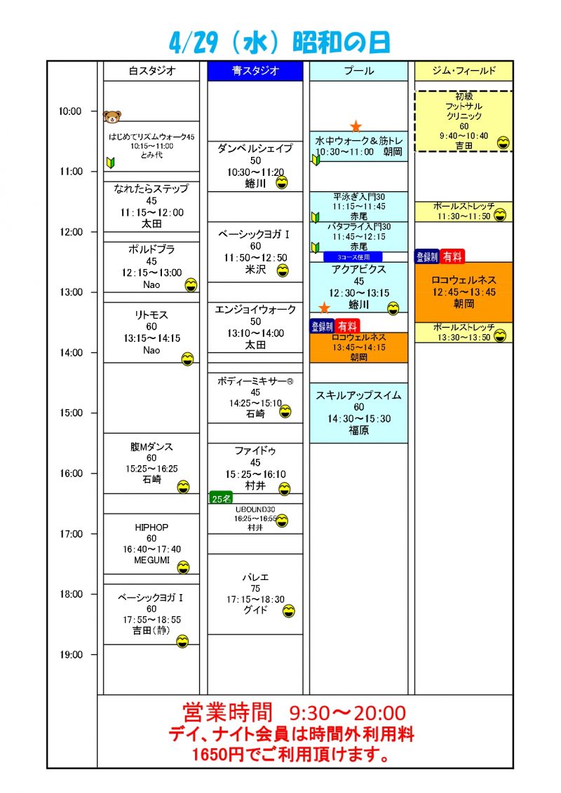 4/29(水)祝日スケジュールはこちらです