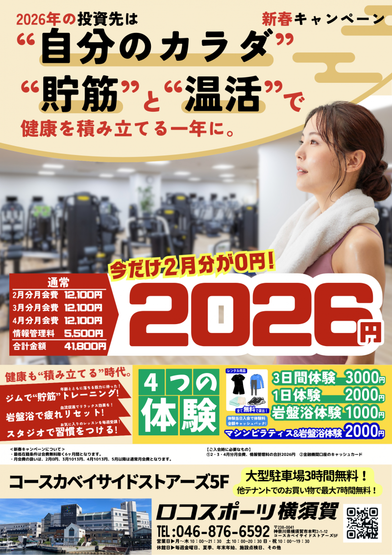 ジム・岩盤浴・スタジオをまとめて始める新春キャンペーン。初期費用がなんと2026円でスタートできます。