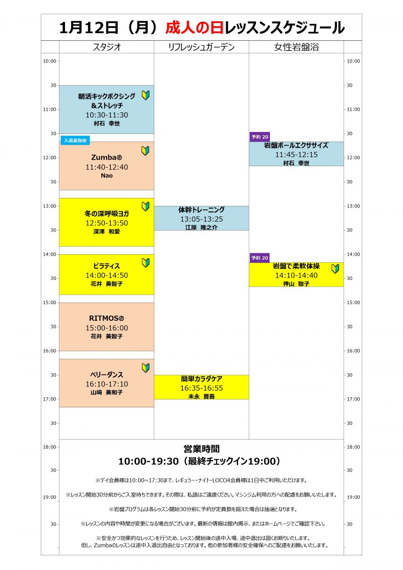 2026年1月12日(月) 成人の日 レッスンスケジュールです