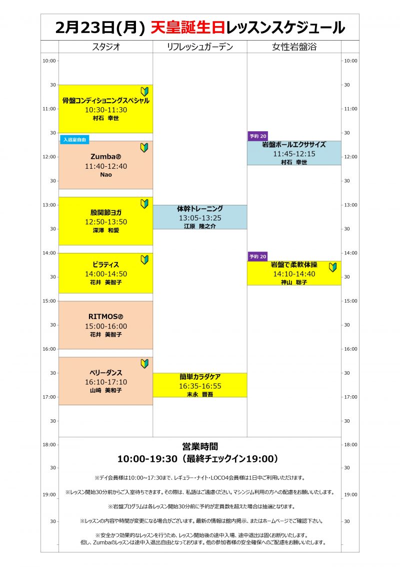 2月23日(月) 天皇誕生日レッスンスケジュールです
