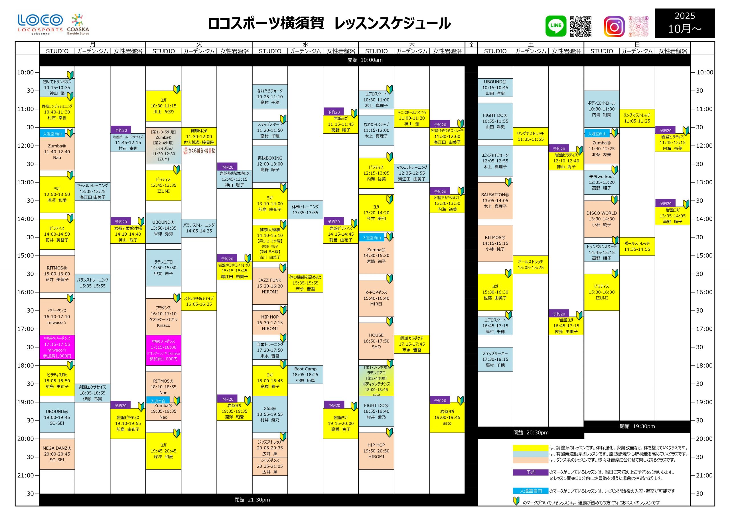 < スタジオレッスン・岩盤浴・パーソナルトレーニングが自慢のスポーツクラブ!> レッスンスケジュール schedule 私たちが大切にしているのは対話。 初心者から上級者まで、あらゆるタイプに合わせた優しいサポートで、一緒にレベルアップしていきます。 LOCO NAVI ロコスポーツ横須賀のご案内 HOT PROGRAM /岩盤プログラム ヨガやピラティスなど、岩盤浴で行う岩盤プログラムで心身のリフレッシュ! STUDIO / スタジオレッスン 初心者でも安心して参加できるプログラムがいっぱい! GYM / ジム 人気のフィットネスマシンを多数配置!トレーニング初心者から上級者まで楽しめます。 STONE SPA / 岩盤浴 新陳代謝UPや美容などに効果的!ひろびろとした快適空間。 REFRESH GARDEN / リフレッシュガーデン 木や緑に囲まれた空間で行うリフレッシュレッスン。 スマホでバーチャル見学! ロコスポーツ横須賀施設内を、スマホやPCでご覧いただけます。 バーチャル見学はこちら